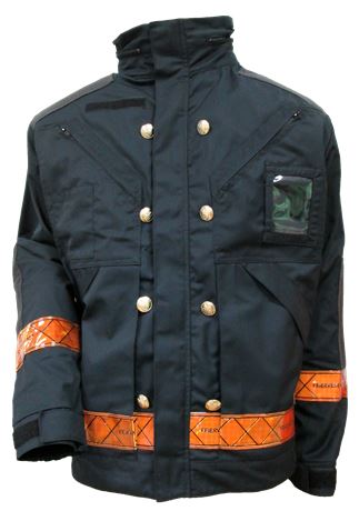 Glidelås opp til krage med stormklaff på utsiden. Aramid forsterkning på skuldre og på albue med polstring. To brystlommer med glidelås, en med blyantlomme og en med ID-lomme. Skrålommer nederst på jakken lukkes med klaffer. To striper feierrefleks på front, rygg og ermer. Åtte gullknapper i front. Bevegelighetsfold i rygg og noe forlenget bak. Ermene reguleres med mansjett med borrelås. Hette i kragen som kan skjules med glidelås. Innerlomme venstre side.