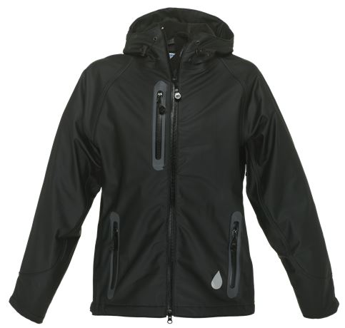 Vanntett jakke med teipede sømmer. Hette med regulering. Refleksdråper på nedkant rygg og i front. Ventilering under erme. Brystlomme på høyre side og to framlommer med glidelås.